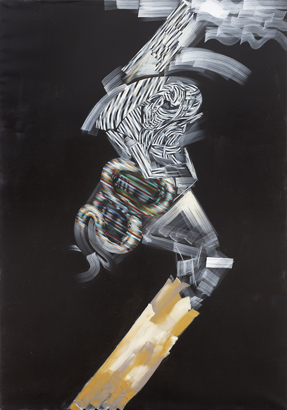 Aus diesen schillernden Gewässern abstrakter Felder von Spiralen, Kreisen, Wellen und Linien tauchen jäh perspektivischgegenständliche Figuren auf.